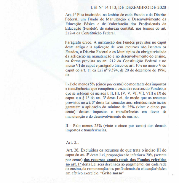De acordo com um trecho do relatório de auditoria da GIPE "os valores do montante dos recursos de onde devem ser destinados o mínimo de 70% para remuneração dos profissionais da educação, conforme o combinado dos Art 1º com Art. 26 da lei 14.113/2020, que em momento algum se prende apenas aos recursos REFERIDOS no caput do Art. 1 º, mas sim, respeitando os desdobramentos do Art. lº, destina no mínimo 70% dos recursos REFERIDOS no caput do Art. 1 º e nos incisos I e Il do parágrafo único do mesmo artigo".