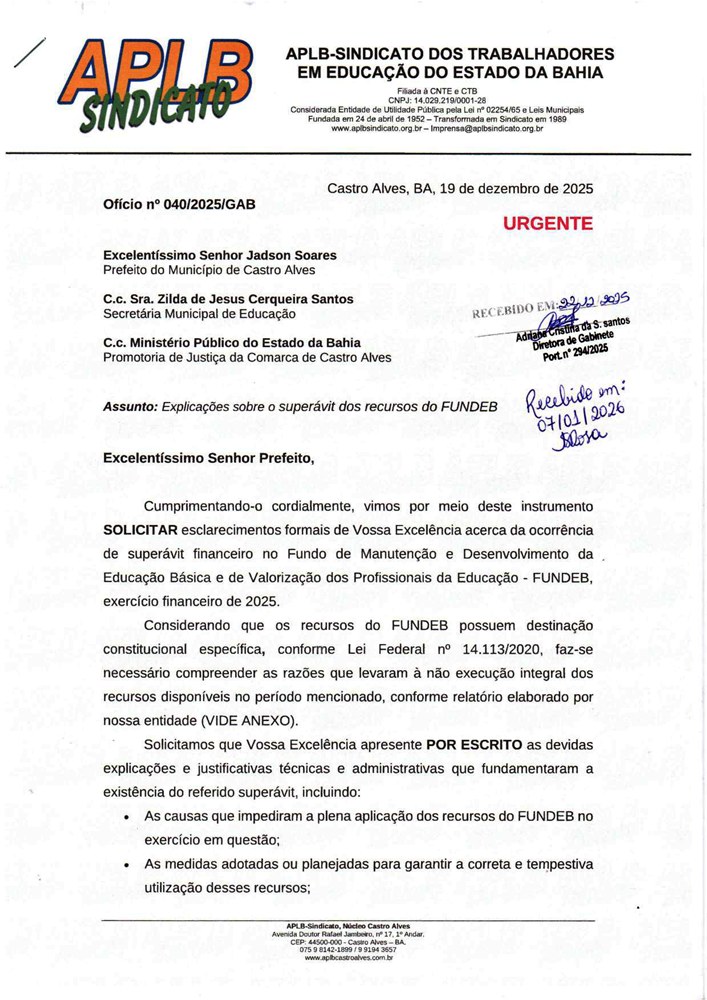 A APLB-Sindicato, representante dos servidores e servidoras da educação do município de Castro Alves, protocolou no dia 22 de dezembro de 2025 um ofício junto à Prefeitura Municipal exigindo esclarecimentos detalhados sobre o superávit financeiro nas contas do Fundo de Manutenção e Desenvolvimento da Educação Básica e de Valorização dos Profissionais da Educação (Fundeb).